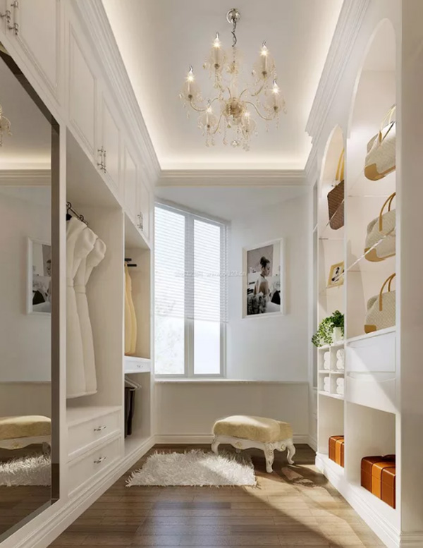 步入式衣帽間的設(shè)計(jì)要“以人為本”講究珍藏機(jī)能的公道化和人道化。更衣間內(nèi)部主要由板材拼裝而成,盡管工藝并不復(fù)雜,但做好也并非易事。