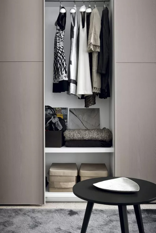 衣帽間內(nèi)的壁柜多采用開(kāi)放形式,所有的衣物都暴露在外面,很容易雜亂無(wú)章,一片散亂。因此,在設(shè)計(jì)時(shí)區(qū)域劃分和樘板分割十分重要。在樘板分割之前,需要充分分析使用主人所放物體的尺寸大小,包括長(zhǎng)度、體積、與重量等,考慮哪些是常用的,哪些是備用的,誰(shuí)適合放在上面,誰(shuí)適合放在下面,放置拿取是否利便,諸如此類問(wèn)題,最后,根據(jù)這些整體分析,打造物架分割圖。