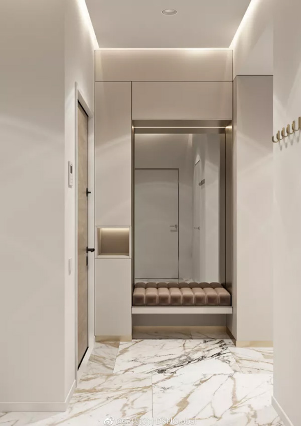 2、有寬敞衛(wèi)浴間的家居,可利用入口做一排衣柜再設(shè)置大面積穿衣鏡來(lái)延伸視覺(jué),使日常生活更加方便、快捷;。