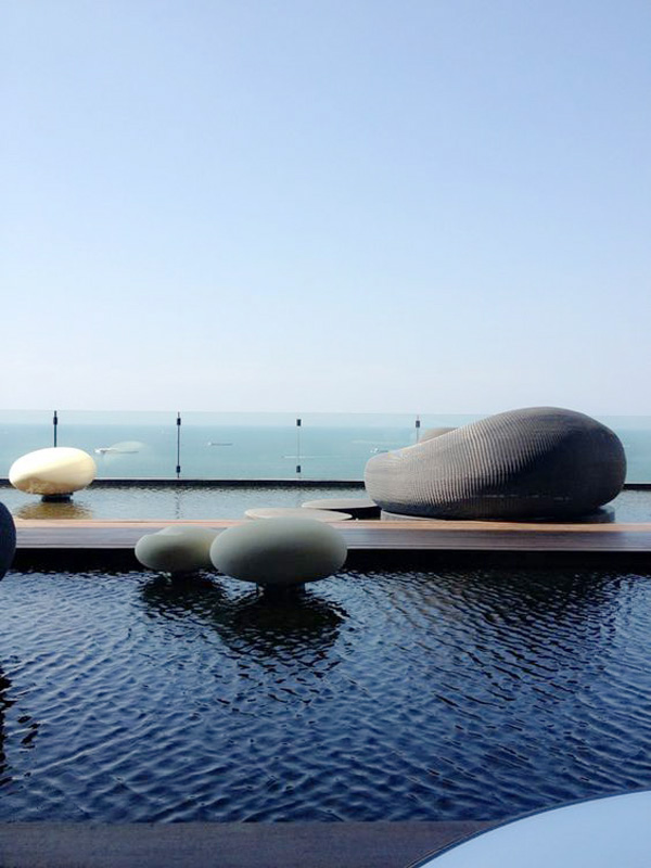 每個區(qū)域的鋪裝不同,每個區(qū)域內(nèi)部的鋪裝相同或相近,與植物搭配,形成高檔度假酒店的氛圍,并起到指示和分隔的功能。