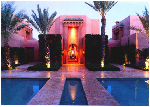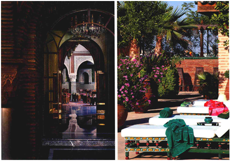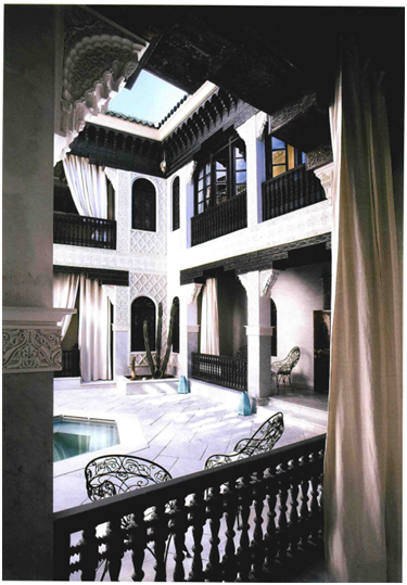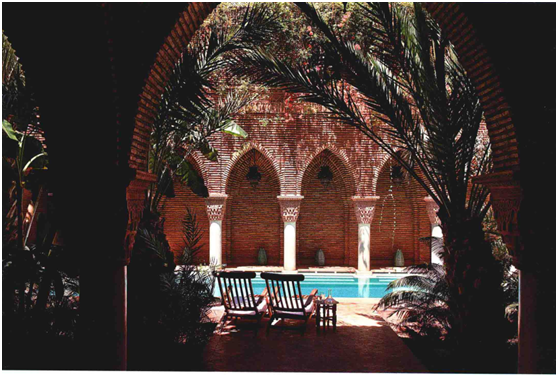 摩洛哥風(fēng)格代表的是一種特有居住環(huán)境造就的極休閑的生活方式,大部分摩洛哥居住建筑建立在伊斯蘭教地區(qū)的傳統(tǒng)教義之上。對于阿拉伯人來說,室外空間留給工作之用,而室內(nèi)空間則是避難所,因此他們將主要的精力用于裝飾室內(nèi)特別是中心庭院,表現(xiàn)出富麗堂皇的特色。因為伊斯蘭教注重保護(hù)婦女的隱私,房屋往往圍繞一個中心庭院而布局,中間的三重拱形觀景走廊引向2-4間對稱布置的房間,房間的形狀通常狹長而又高聳。