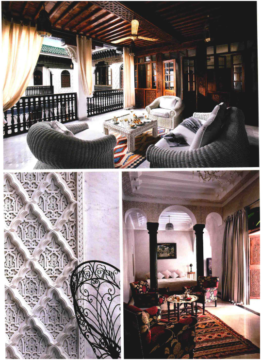 傳統(tǒng)的摩洛哥室內(nèi)裝飾藝術(shù)源自于柏柏爾人。他們傳統(tǒng)的紡織品、鍛造金屬、彩色玻璃、陶器、皮革、木雕、厚蒲團(tuán)、燈籠式吊燈等至今仍被世界各地的設(shè)計師們熱衷應(yīng)用于其折中風(fēng)格的作品當(dāng)中。今天的摩洛哥工匠和設(shè)計師們繼承了摩洛哥本土的傳統(tǒng)裝飾藝術(shù),運用本地的材料和華麗的裝飾圖案,創(chuàng)造出獨一無二的摩洛哥室內(nèi)空間,風(fēng)靡世界各地。